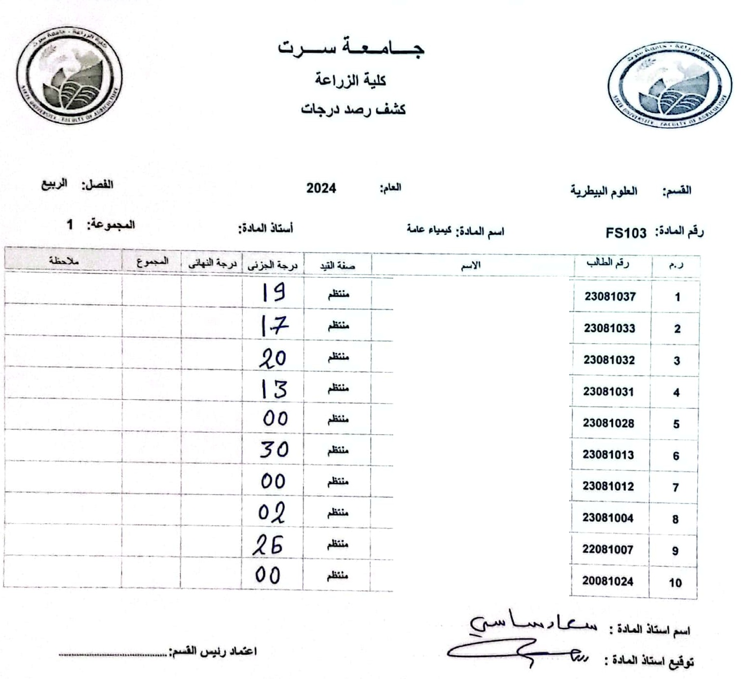 أعمال الفصل القسم العام و قسم العلوم البيطرية .