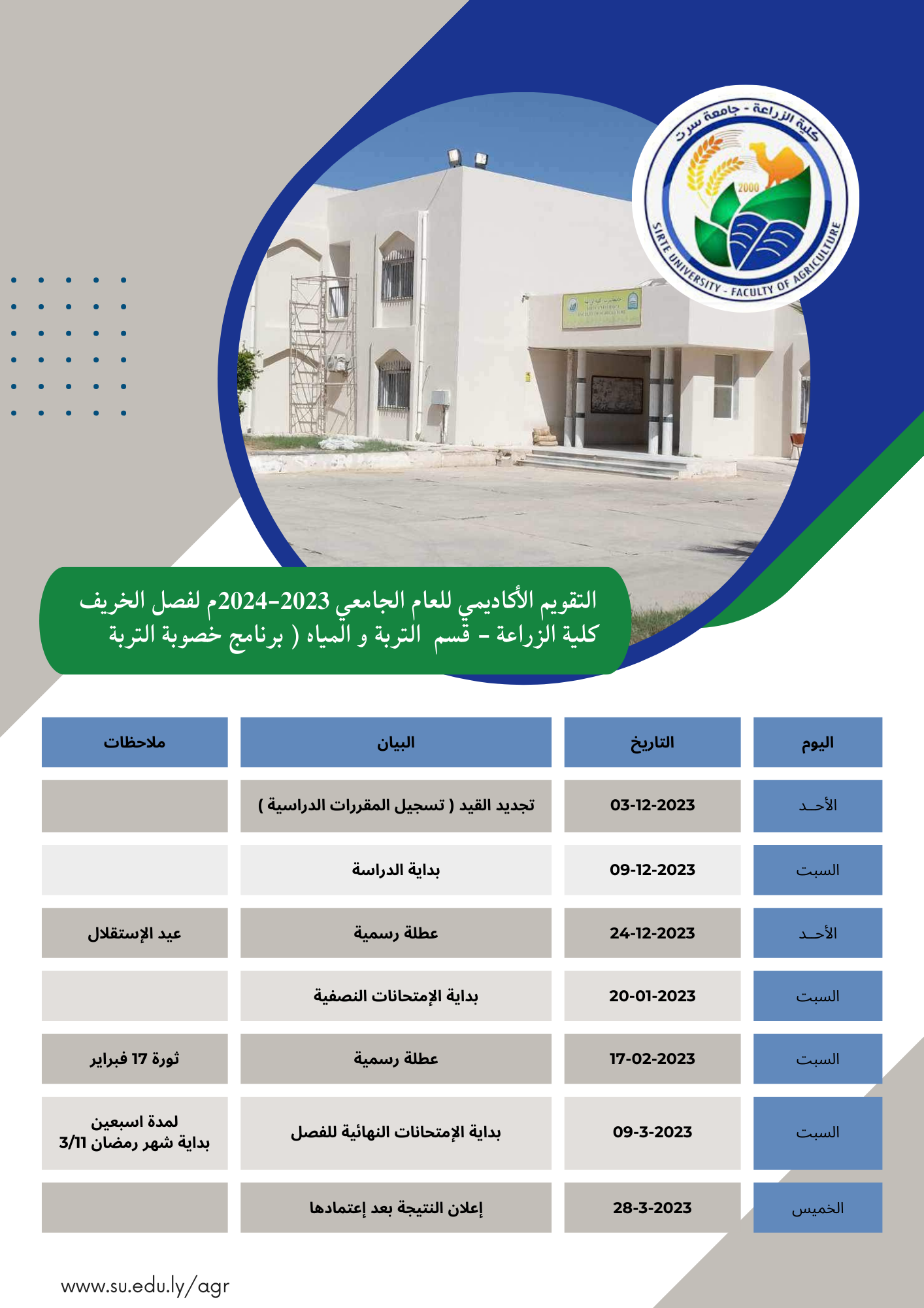 التقويم الأكاديمي للعام الجامعي لفصل الخريف 2023/2024م كلية الزراعة - الدراسات العليا - قسم التربة و المياه ( برنامج خصوبة التربة ) .
