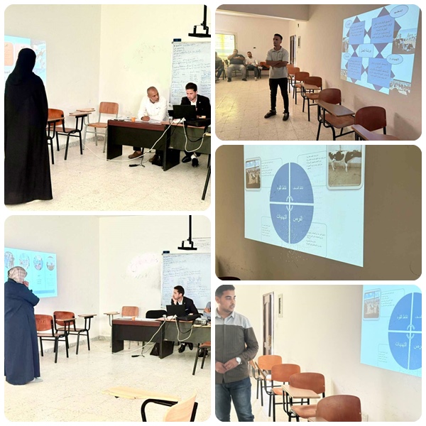 تنظيم جلسة مناقشة لمقرر التدريبات الحقلية في الانتاج الحيواني و صحة و أمراض الحيوان وذلك من خلال عرض تقديمي يركز على الزيارات الميدانية التي تم إجراؤها.