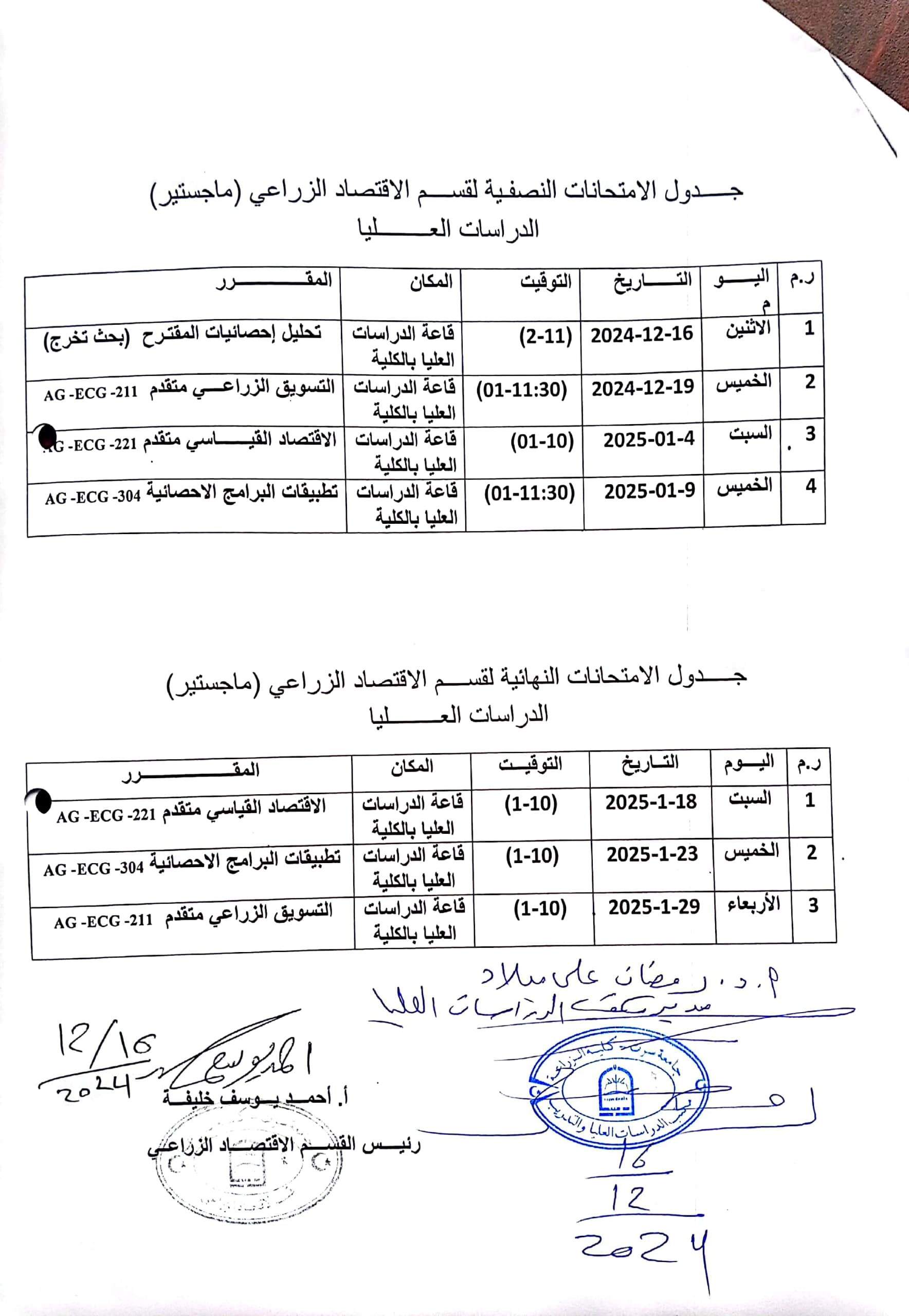 جدول الإمتحانات النصفية والنهائية لطلبة الدراسات العليا ( قسم الاقتصاد الزراعي ) لفصل الخريف ( 2024-2025 م ) .