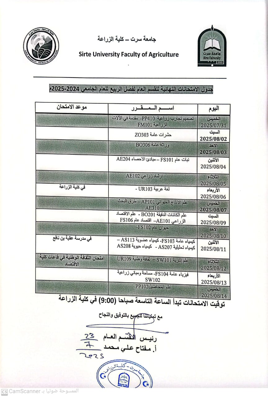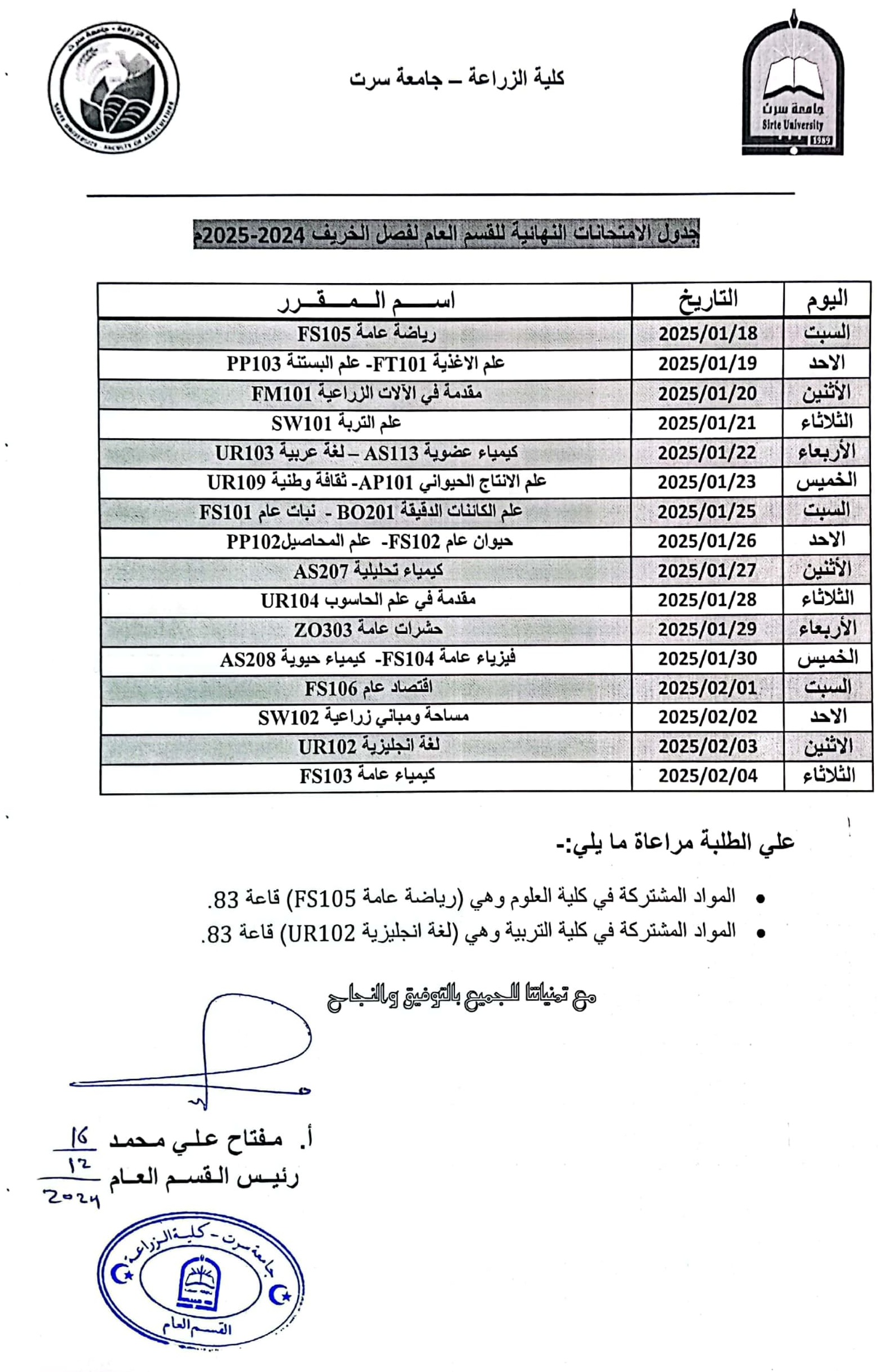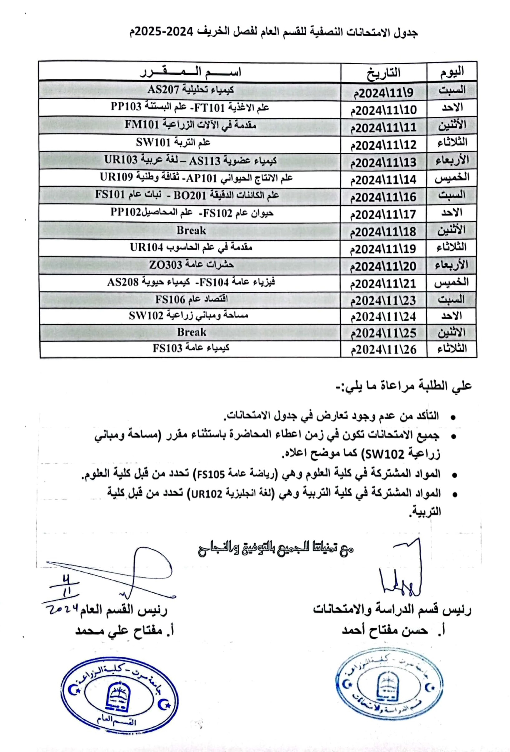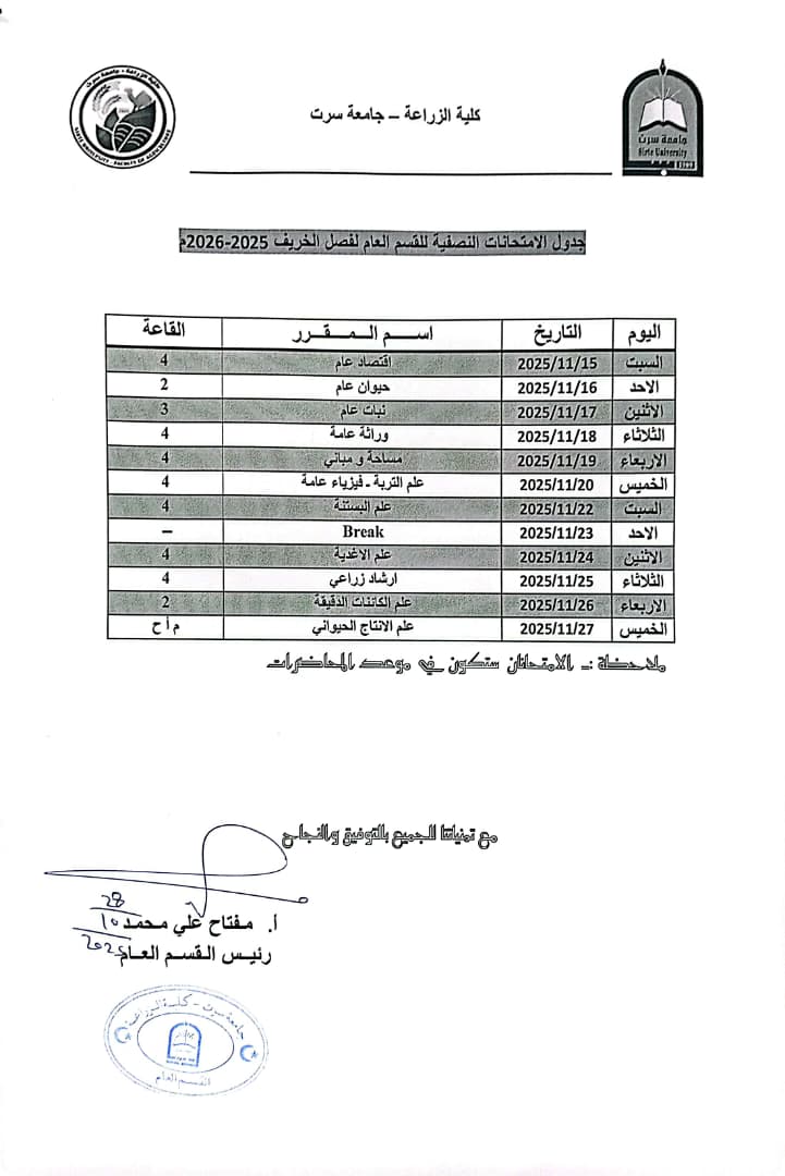جدول الامتحانات النصفية للقسم العام لفصل الخريف 2025-2026م .