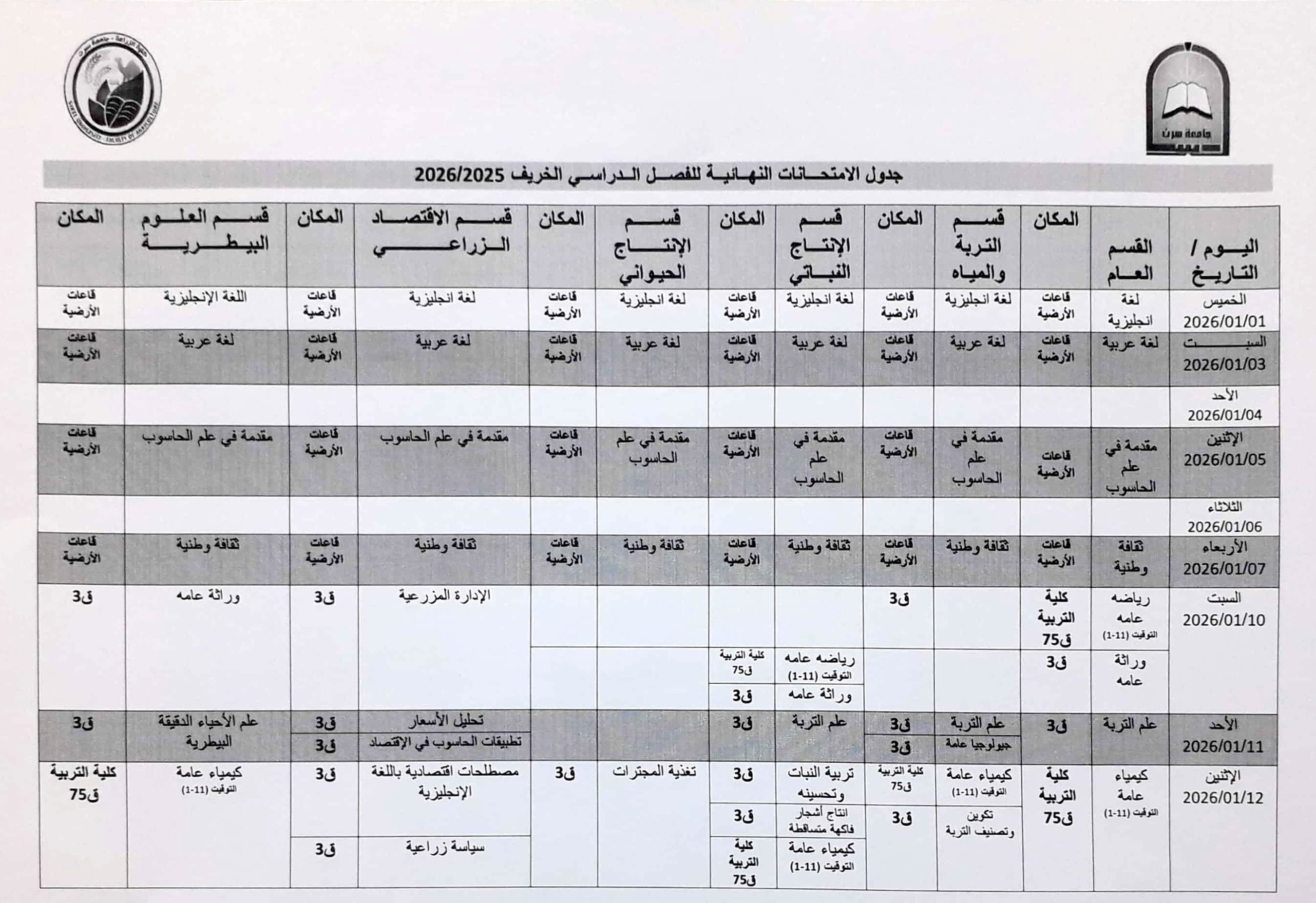 جدول الامتحانات النهائية لفصل الدراسي الخريف 2026/2025 م .