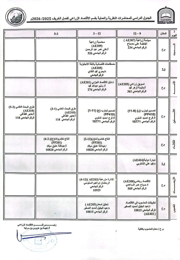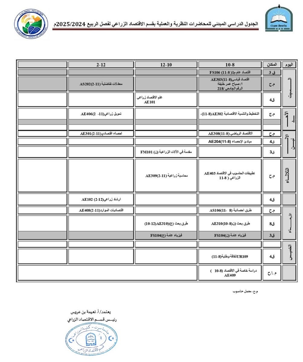 جدول المحاضرات النظرية والعملية لفصل الربيع 2024- 2025 م.