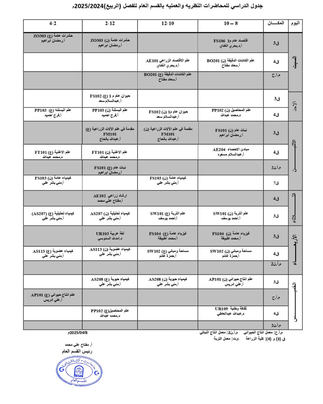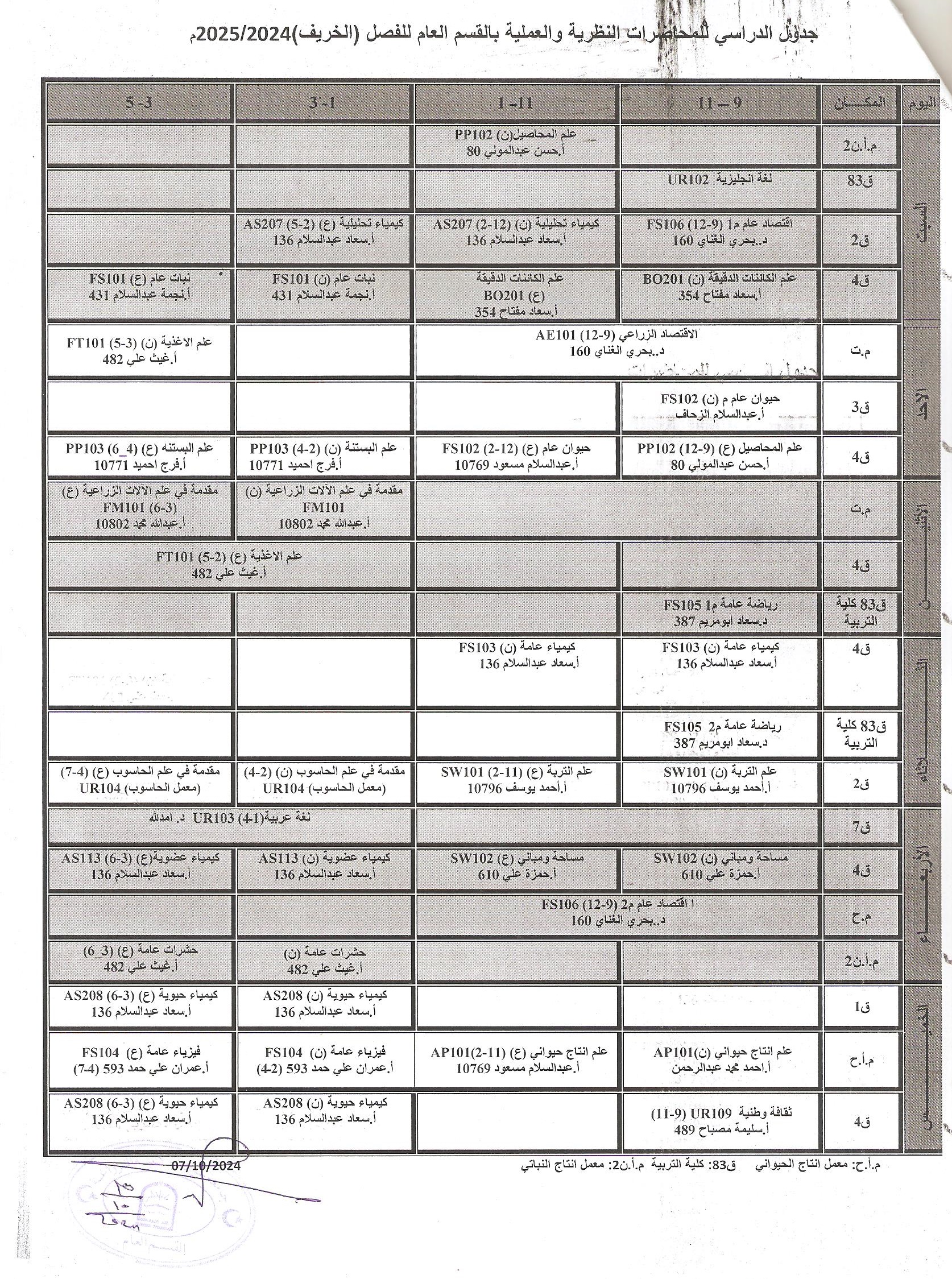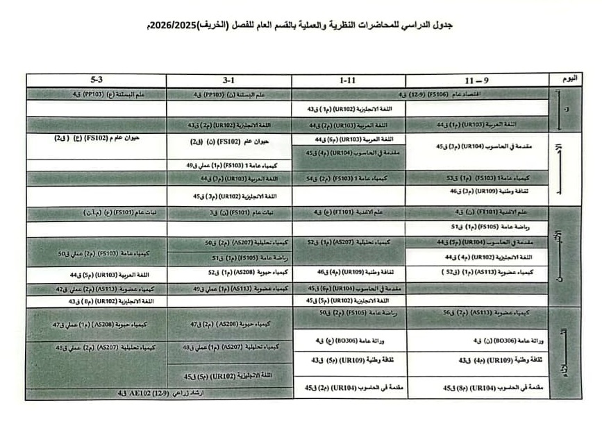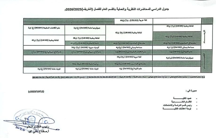 جدول المحاضرات النظرية والعملية لفصل الخريف 2025-2026 م .