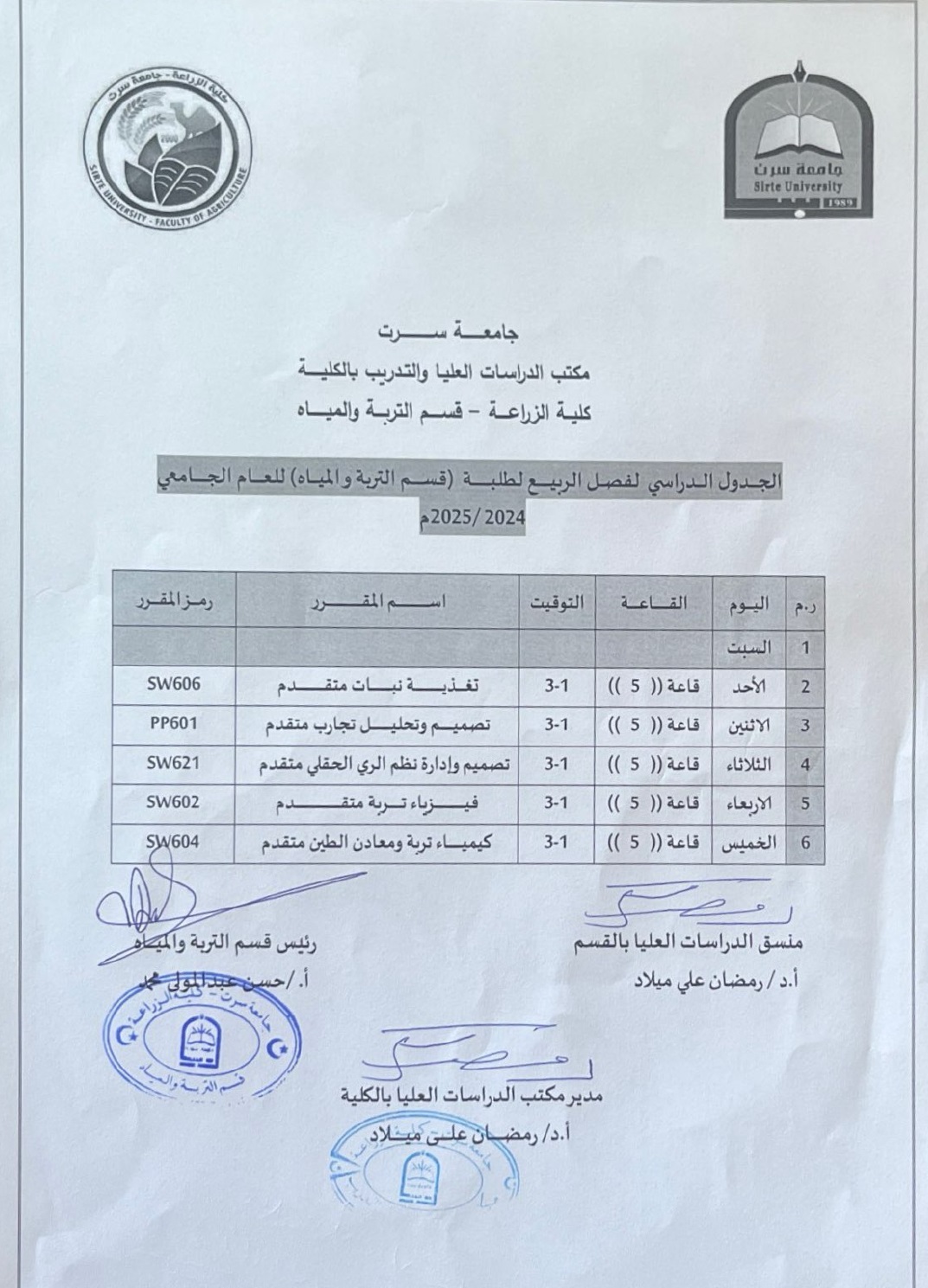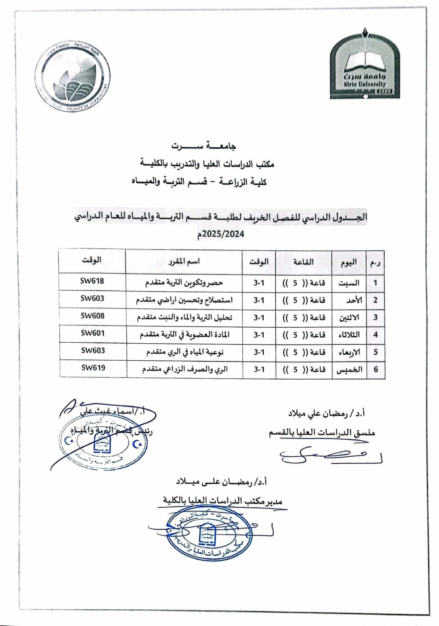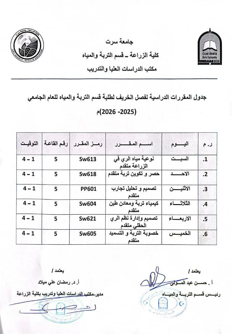 الجدول الدراسي لفصل الخريف لطلبة(قسم التربة والمياه ) للعام الجامعي 2025-2026 م .