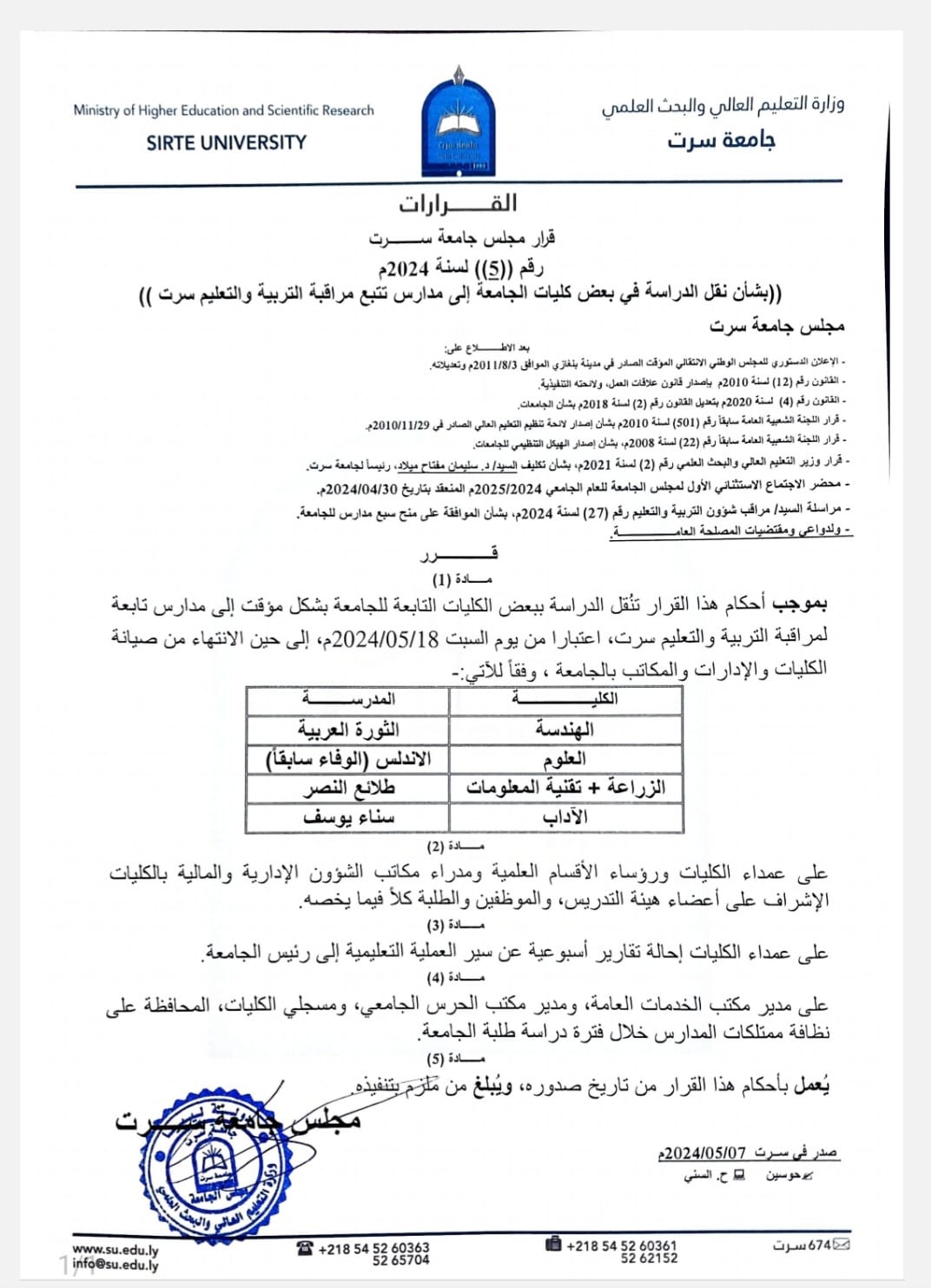 قرار رقم 5 لسنة 2024 - بشأن نقل الدراسة في بعض كليات الجامعة إلى مدارس تتبع مراقبة التربية والتعليم سرت