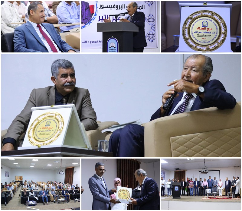 حيث ألقيت خلال الحفل العديد من الكلمات التي أشادت بالدور الكبير الذي قام به البرفيسور التير من خلال تقديم نتاجه العلمي الذي اسهم في دعم الدراسات الاجتماعية والبحث العلمي ، كما تم تقديم عرض مرئي يتناول المسيرة العلمية للمفكر التير ونتاجه العلمي ، تم بعد ذلك تقديم درع العطاء من جامعة سرت للمفكر البرفيسور مصطفى عمر التير إضافة إلى عدد من إصدارات الجامعة.