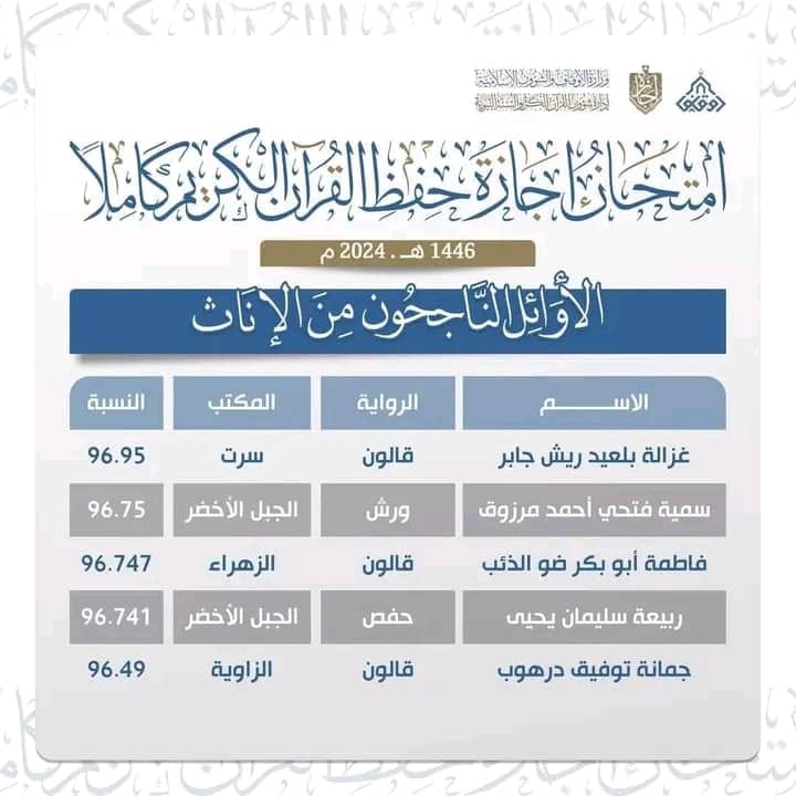 في نجاح اخر وبواسطة طلابها هاهي جامعة سرت تزدان اليوم بتشريف إحدى طالباتها لها بحصولها على الترتيب الاول بامتحان اجازة القرآن الكريم كاملا .. فقد تحصلت الطالبة غزالة بلعيد ريش جابر التابعة لكلية تقنية المعلومات على المرتبة الأولى بنسبة 96.95 % بامتحان اجازة القرآن الكريم كاملا والذي اشرفت عليه وزارة الاوقاف والشؤون الإسلامية بالحكومة الليبية .. فهنيئا للطالبة وهنيئا للجامعة بها .