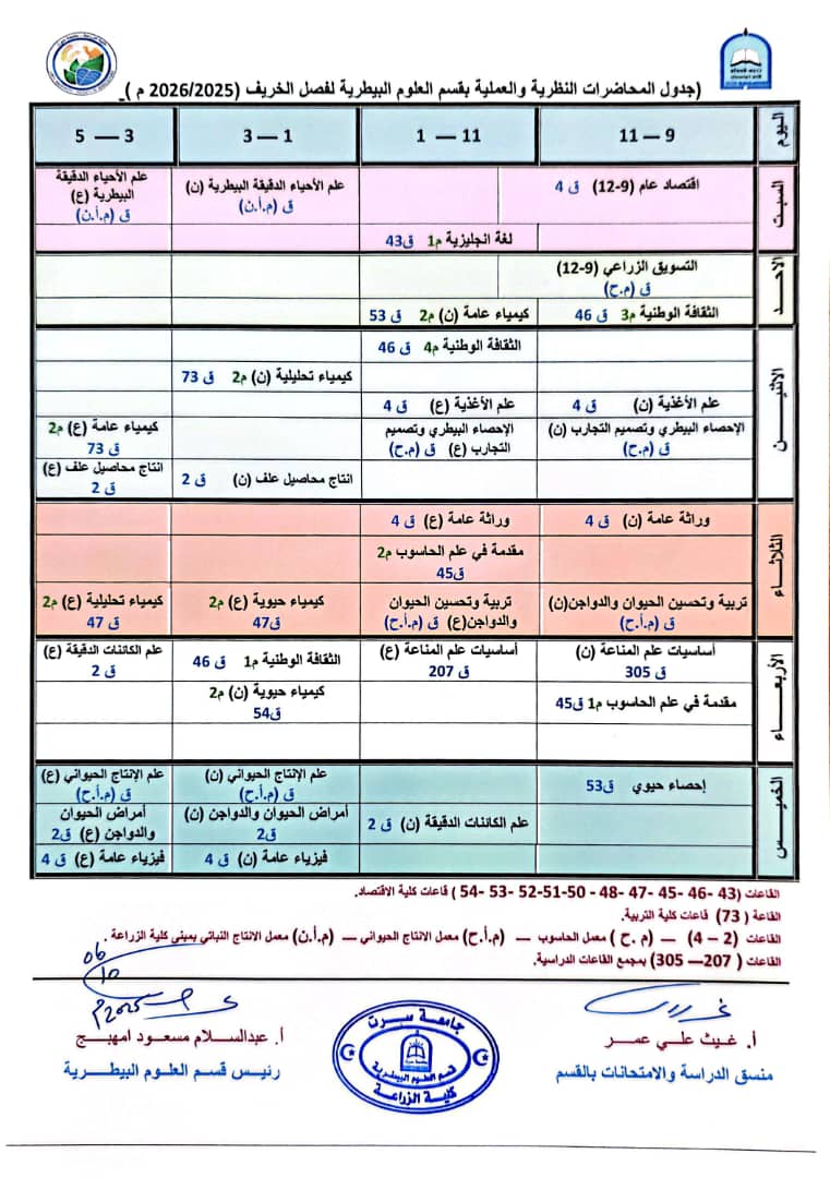 جدول المحاضرات النظرية والعملية لفصل الخريف 2025 / 2026م .