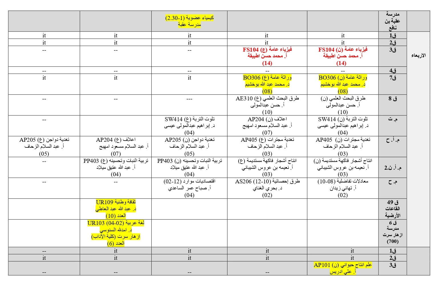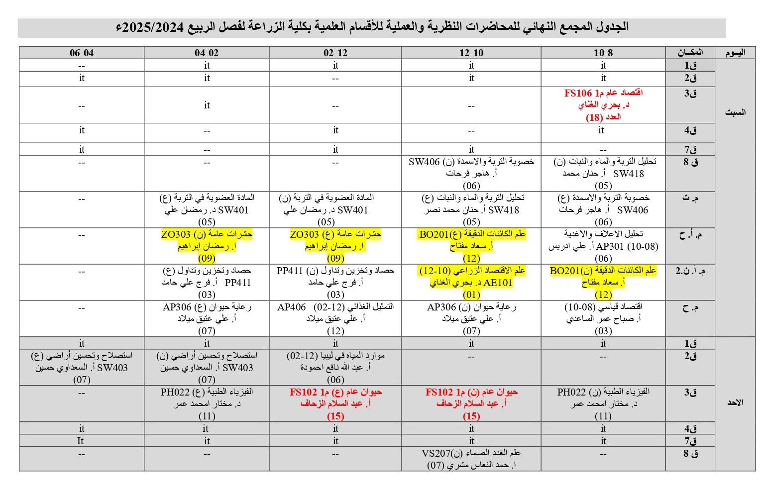 جدول المحاضرات النظرية والعملية كلية الزراعة للفصل الدراسي الخريف 2026/2025 م .