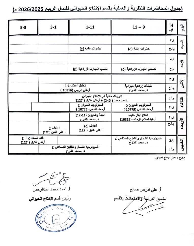 جدول المحاضرات النظرية والعملية لفصل الربيع 2025-2026 م .
