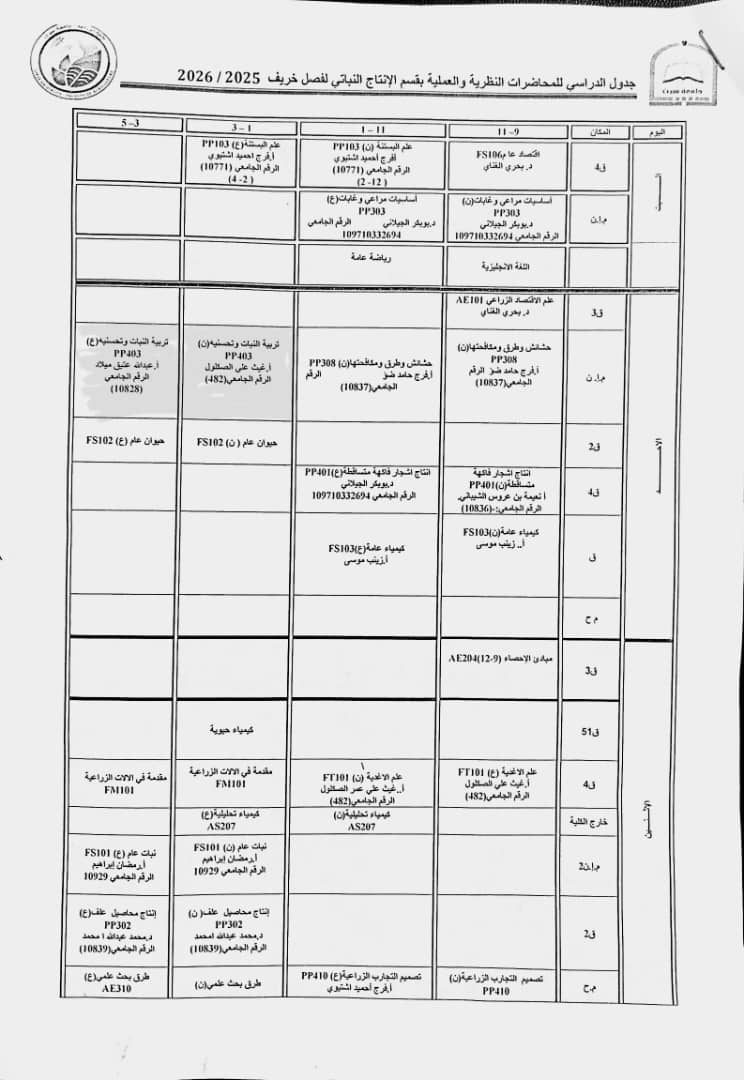 جدول المحاضرات النظرية والعملية لفصل الخريف 2025-2026 م.