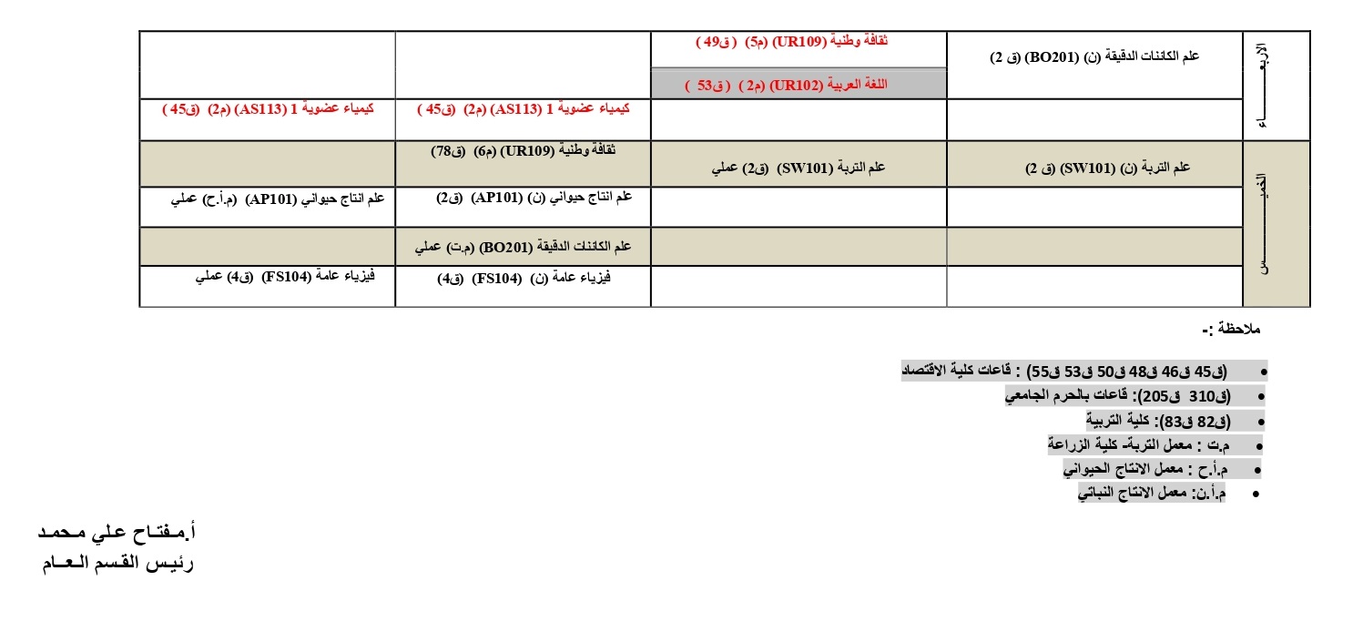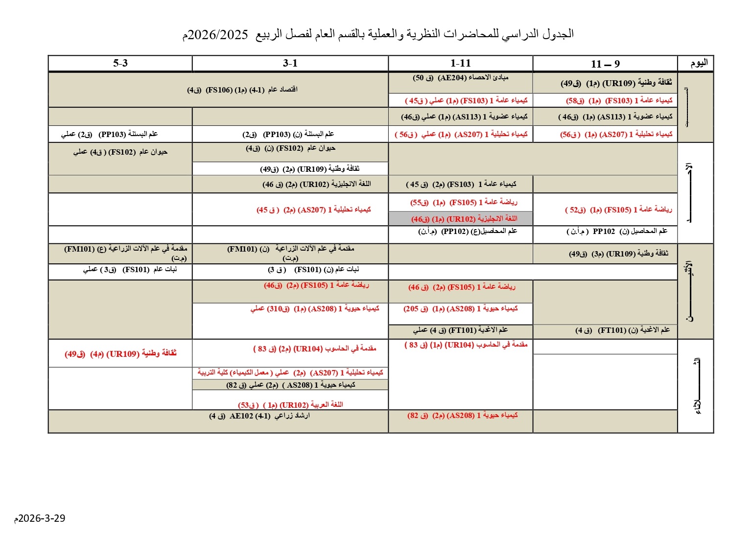 جدول المحاضرات النظرية والعملية لفصل الربيع 2025-2026 م .
