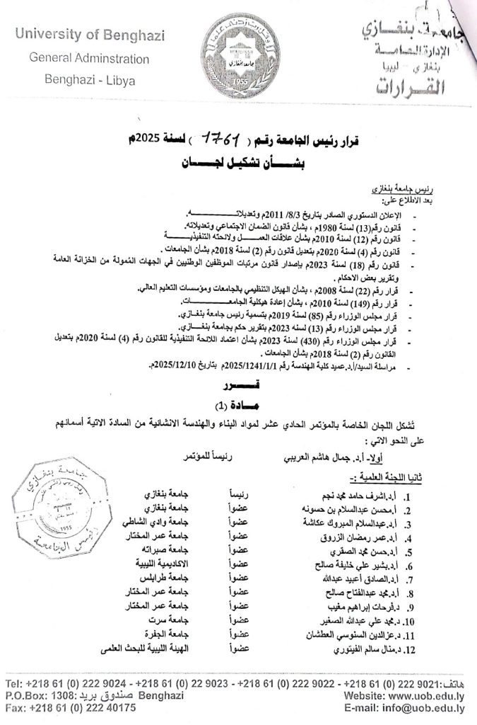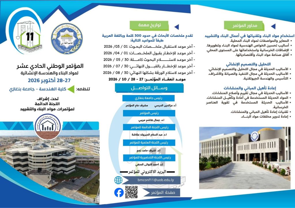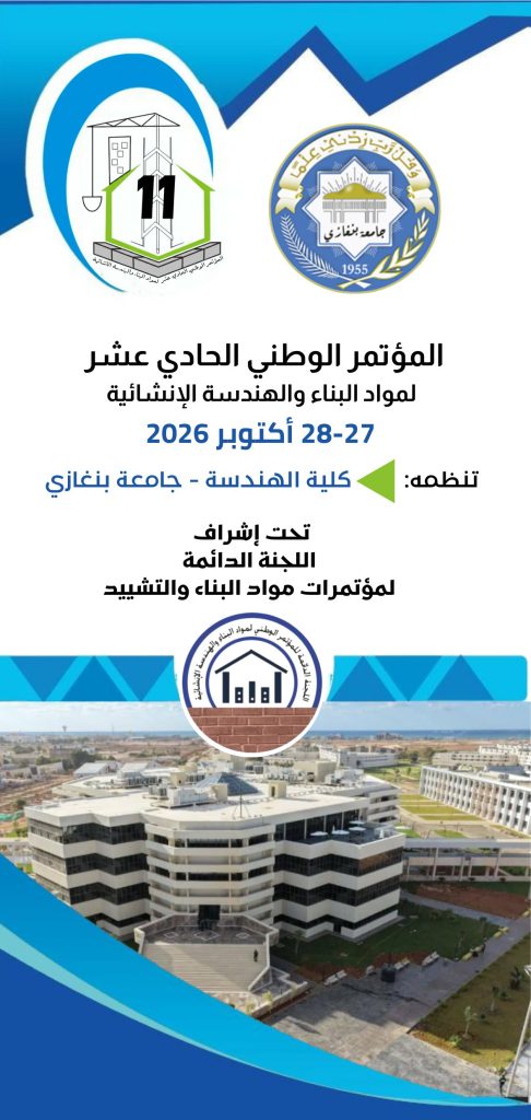 تحت اسم المؤتمر الوطني الأول لمواد البناء والهندسة الإنشائية، ونظرا للنجاح الكبير الذي حظي به المؤتمر آنذاك، أوصى المؤتمر بالاستمرار بعقده كل عامين، وتم تشكيل اللجنة الدائمة للمؤتمر أوكل إليها مهمة متابعة عقد هذه السلسة من المؤتمرات، وتوالى بعدها انعقاد المؤتمر لأربع دورات متتالية في عام 2004، 2006، 2008، 2010 في كل من جامعة المرقب ومصراتة والزاوية وأكاديمية الدراسات العليا بجنزور، ونظرا للظروف التي مرت بها بلادنا الحبيبة فقد تأخر عقد الدورة السادسة عن موعدها المقرر في عام 2012، ولكن بفضل الله أولا ثم بالجهود المتواصلة للجنة الدائمة للاستمرار في عقد هذه السلسة من المؤتمرات فقد تم عقد المؤتمر السادس بجامعة الجبل الغربي بغريان عام 2016، وفي عام 2018 تم عقد المؤتمر السابع بجامعة عمر المختار بالبيضاء، وفي عام 2020 تم عقد المؤتمر الثامن بجامعة بني وليد، وفي عام 2022 تم عقد المؤتمر التاسع بجامعة طرابلس، وفي عام 2024 تم عقد المؤتمر العاشر بجامعة سرت وها هو المؤتمر الوطني الحادي عشر لمواد البناء والهندسة الإنشائية يتم استضافته من قبل جامعة بنغازي في الفترة من 27 – 28 أكتوبر 2026 إيمانا منها بأهمية البحث والتطوير في هذا المجال، وفي الختام نرجو من الله العلي القدير التوفيق والسداد.