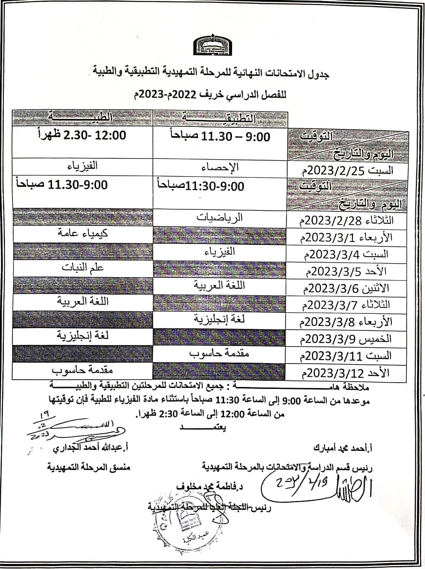 جداول الامتحانات النهائية للمرحلة التمهيدية التطبيقية والطبية للفصل الدراسي خريف 2022م-2023م