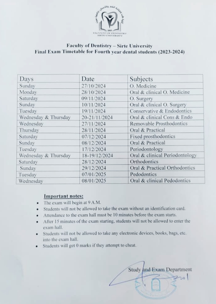 جدول الامتحانات النهائية " بكالوريوس " الدور الاول لطلبة السنه الرابعه طب اسنان .
