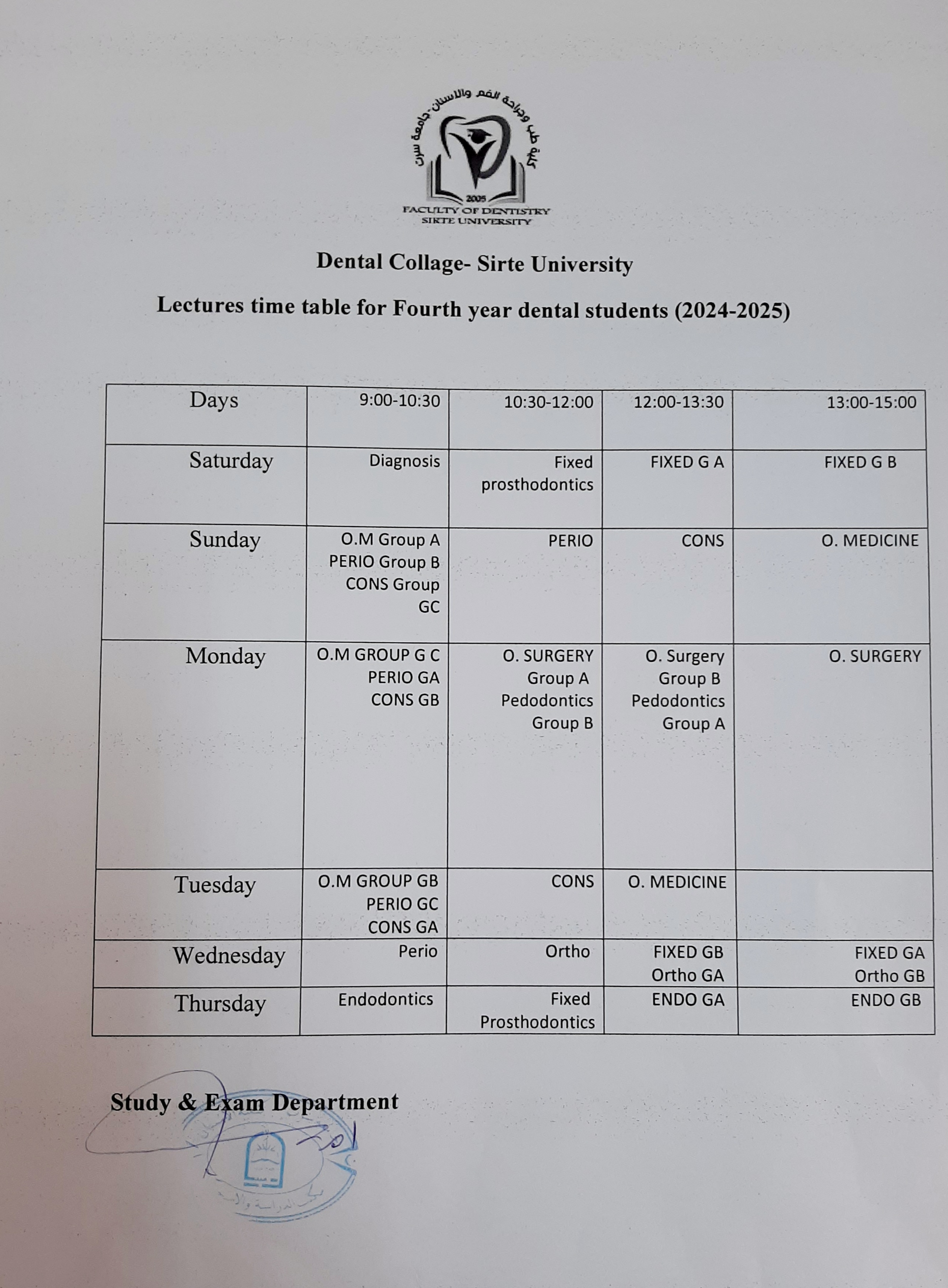 جدول المحاضرات للسنة الرابعة طب اسنان للعام الجامعي 2025.2024م