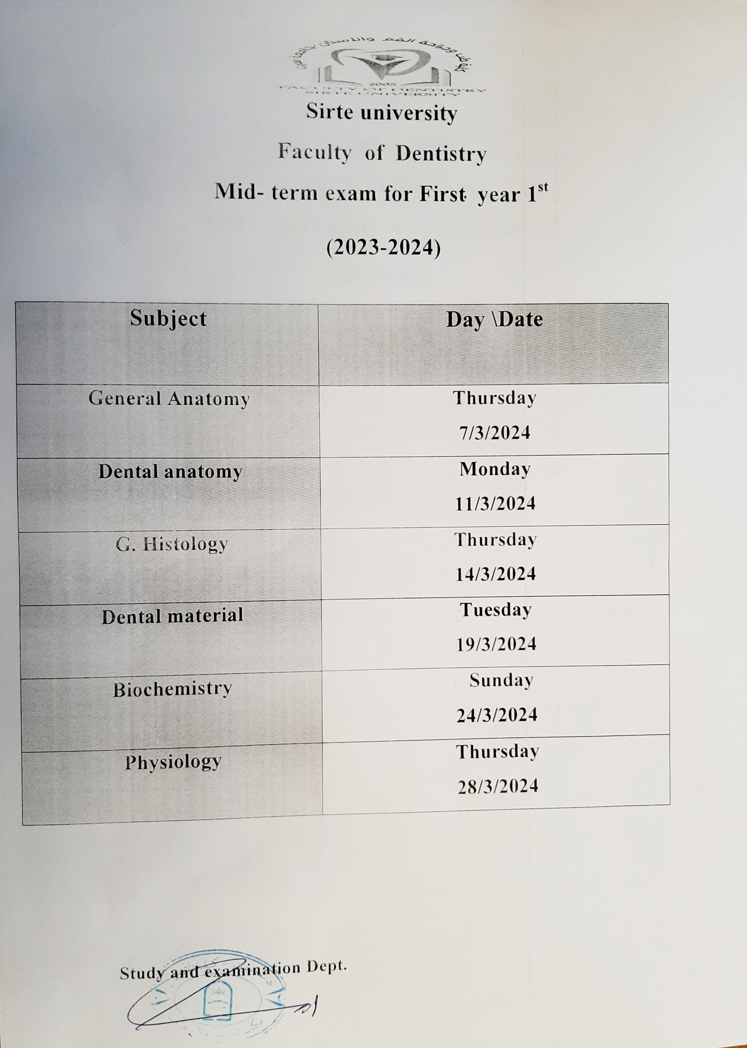 جدول الامتحانات النصفية للسنة الأولى طب أسنان