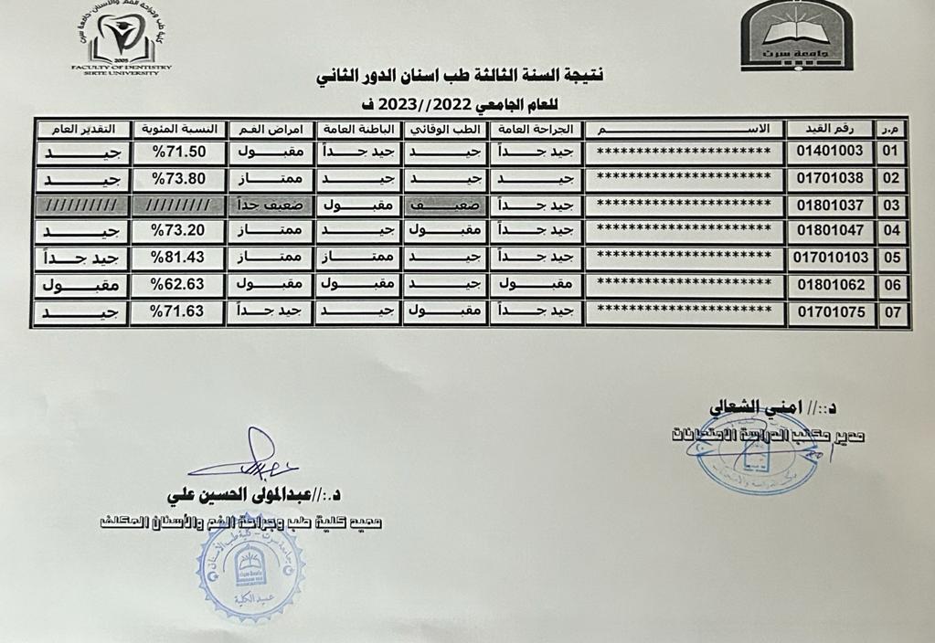 نتيجة الإمتحانات النهائية لسنة الثالثة طب أسنان للعام الجامعي 2022-2023 الدور الثاني